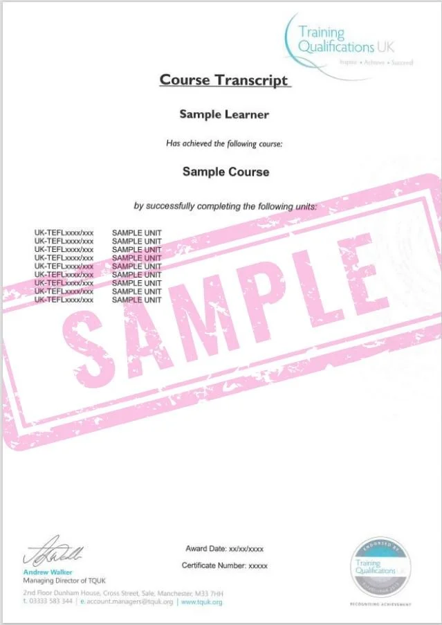 Having a TQUK endorsement is a real mark of excellence, showing that a national awarding body has approved the high standard of training you have achieved. TQUK is a national awarding body regulated by Ofqual (The Office of Qualifications and Examinations Regulation). The certificate includes a registration/certificate number and course module statement which is ideal for making yourself stand out when you are applying for TEFL jobs. If you have received a grade for your course submissions, please note this is not included as part of the TQUK certificate.